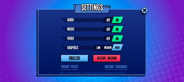 2、游戏正式开始前,点击左上角的设置按钮。在这里可以调整游戏音效、画质、语言等。目前手游只有英文版本,没有中文版本。