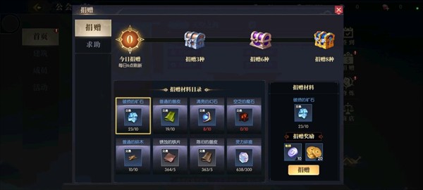 2.公会捐赠功能。日常刷会掉落捐赠材料(账号捐赠可以用小账号刷材料,大账号用:)。当你积累的物资达到一定程度后,你就可以捐款了。每件物资每天只能捐赠一次。当天累积3次、6次、8次即可获得额外奖励。建议捐赠前先收集8种物资。