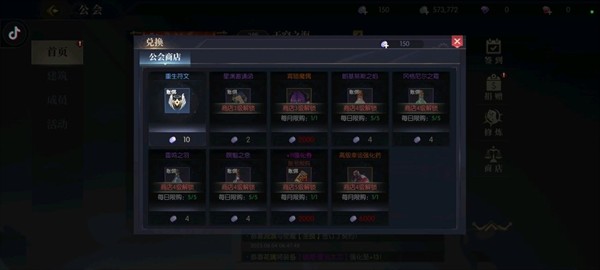 5、公会商店由公会会长升级。等级越高,可以购买的道具就越有价值。每天可以免费购买一瓶体力药水,每月可以购买一个橙色魔宠(需要商店等级达到3级)。强化药剂的购买没有限制。您可以按需购买。只有公会商店生产它们。