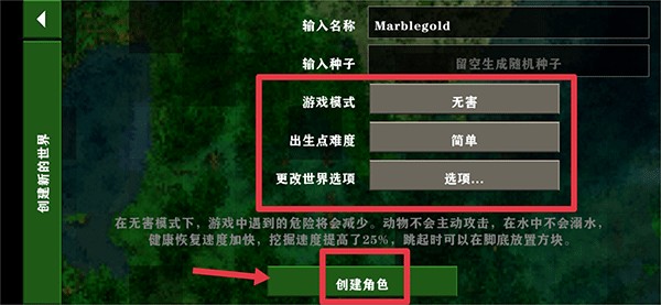 3、设置好名字、游戏模式、出生点难度、更改世界选项等后,点击创建角色;