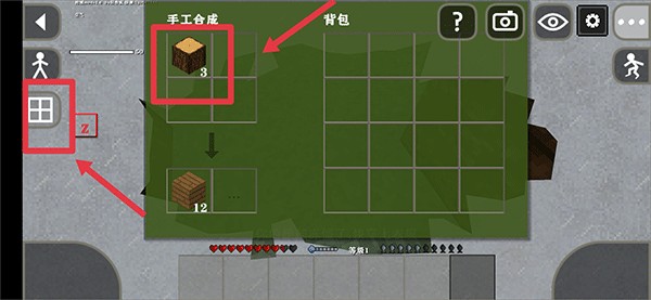 8.收集到的材料可以用来合成更多有用的物品。点击右侧的方块,然后将材料放入手动合成框中。合成后的物品会显示在下方,然后可以将其拉到背包中;