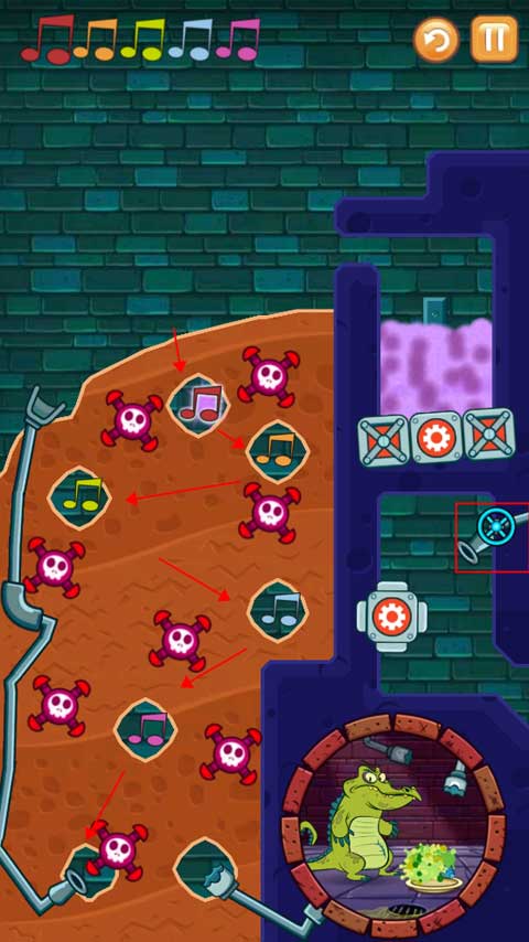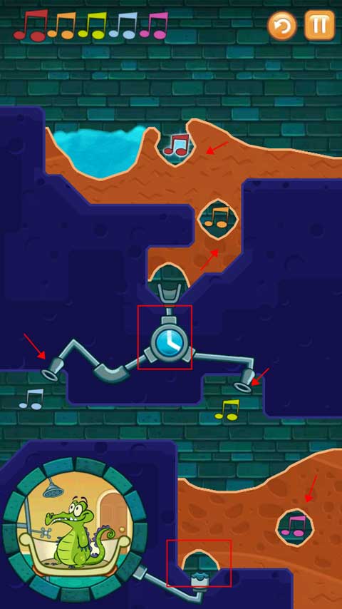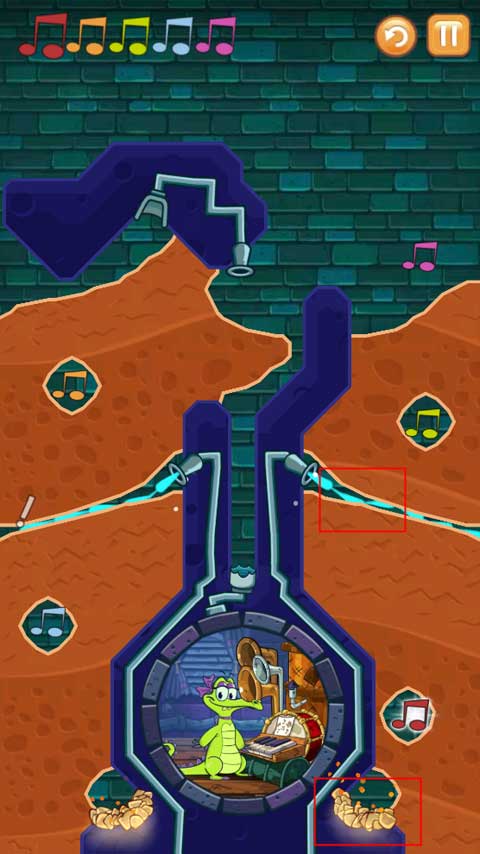 2、第一关是按照正确的顺序将水引入所有音符中,同时还要保证小鳄鱼有水洗澡。