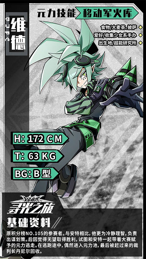 维达,原排名第105位的参赛者。相比Ant,他更加冷静理性,并且负责出谋划策。后来,因为觉得胜利无望,他借助比赛赋予的力量,试图与蚂蚁一起逃跑。逃跑途中,他不小心进入了元力池,最后被冲过来的裁判丹尼尔救了出来。