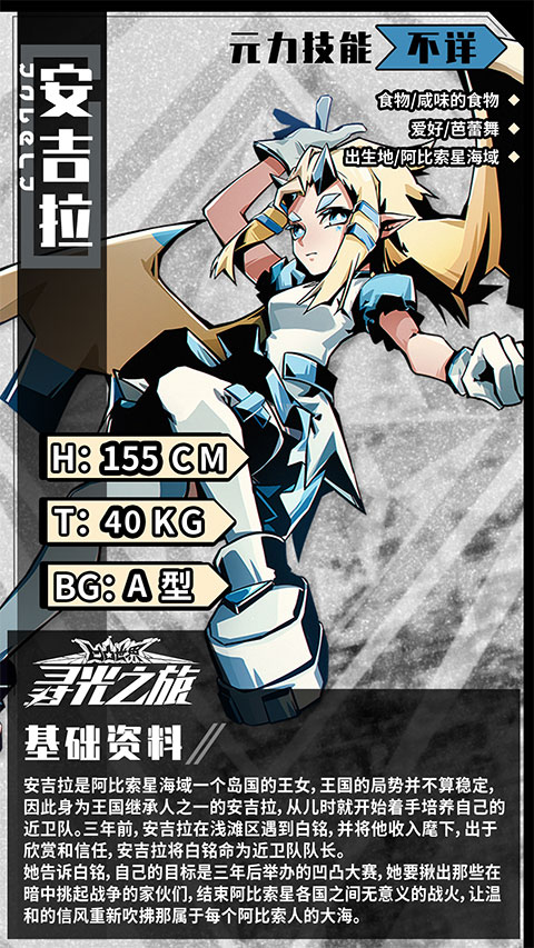 安吉拉,阿比索海域的一个岛国的公主。王国的局势并不稳定。因此,作为王国继承人之一的安吉拉,从小就开始训练自己的侍卫。三年前,安吉拉在浅滩认识了白明,并将他纳入自己的羽翼之下。出于欣赏和信任,安吉拉任命白明为近卫队队长。