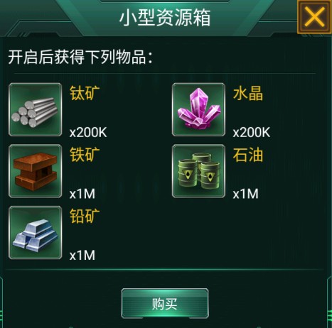 使用后可获得铁矿石、石油、铅矿石各3M,水晶、钛矿石各600K。