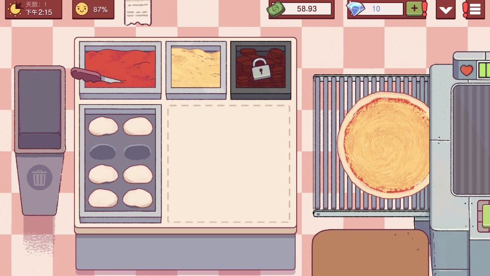 可口的披萨是一款很好玩的模拟经营游戏。游戏中,玩家可以根据顾客的要求制作披萨,出售后可以获得金币。玩家需要先询问客人的要求,然后根据客人的口味进行制作。你可以体验披萨制作的每一步,但需要尽快完成。有些客人很不耐烦。制作的时候可以留意一下各种原料和配料的价格。便宜的多放一点,贵的少放一点是可以的。成为奸商可能会让你赚更多钱。