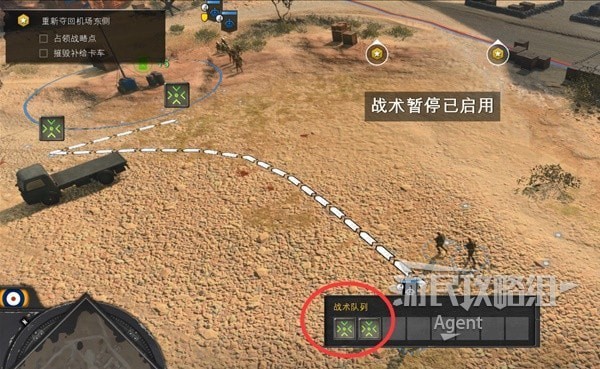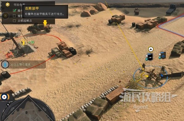 占领战略要点并摧毁附近的补给卡车。注意寻找避难场所,避免人员伤亡。