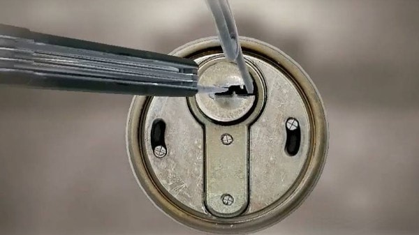 第二步:将撬片插入锁孔,并确认撬片的大致旋转方向;