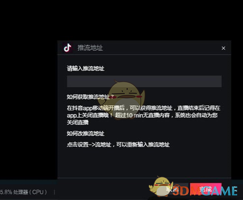 2、可以看到弹出了推送地址界面。用户在上面的输入框中输入。如果您不知道具体推送地址,也可以打开当前正在直播的抖音APP获取推送地址。推送地址可以随时更改。推送地址输入完成后,点击“完成”。