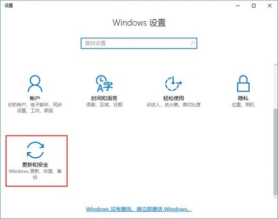 2.打开设置界面后,我们会发现“更新和安全”设置。左键点击;