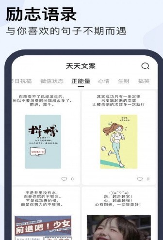 天天文案app是一款拥有大量美文美句的工具,可以轻松帮你掌握很多美文,根据自己的需求轻松找到,直接浏览。在整个阅读过程中,你会获得更多的灵感。在天天文案app发挥自己的文采,寻找合适的短视频和图片文案。有需要可以下载天天文案app使用。