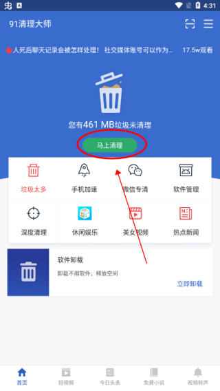 1。下载91清理大师,输入软件,单击立即清洁