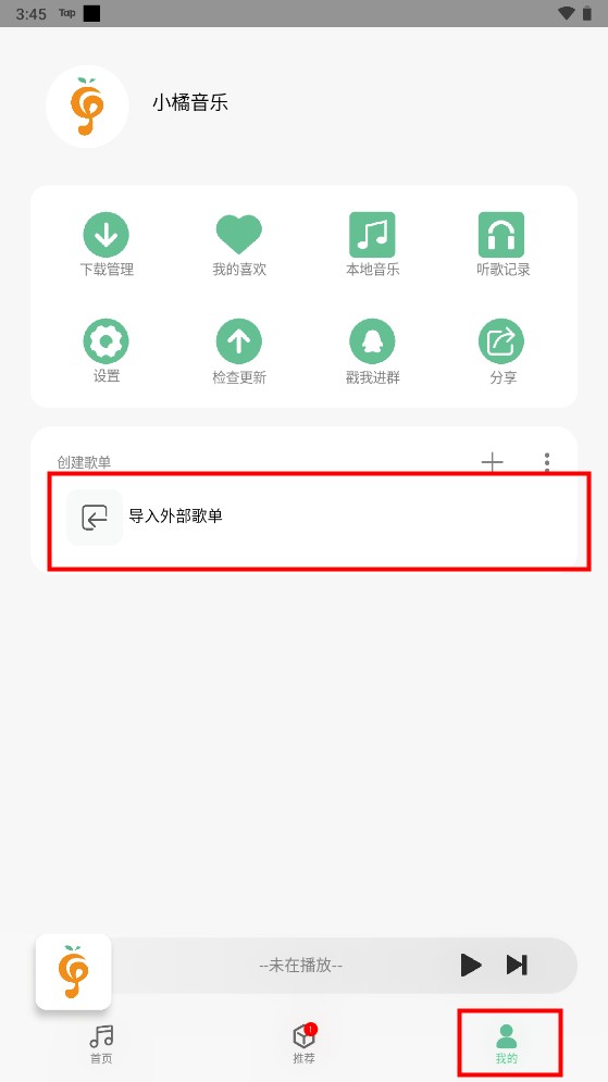 1、用户进入应用程序,选择“我的”页面,点击“导入外部播放列表”。