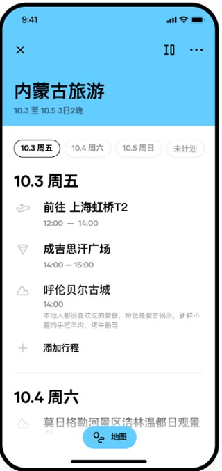 1.新增行程概览显示。您可以通过地图和列表两种方式快速获取多日行程信息汇总。