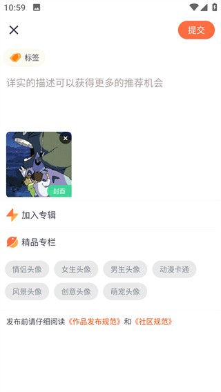 4. 选择要分享的头像,在编辑界面添加描述或附加内容,完成后点击“提交”。