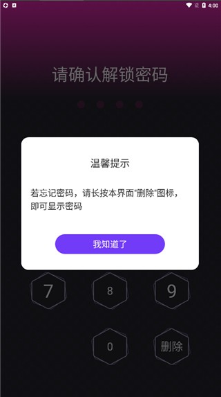 3.如需找回密码,长按“删除”图标,显示找回密码提示。