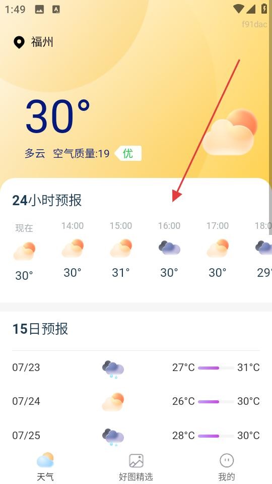 1.打开云云图天气预报软件查看实时天气,包括温度、天气状况、空气质量。向下滚动浏览24小时预报和15天预报,了解天气变化。