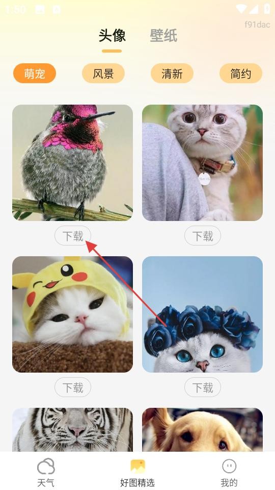 2、切换到好图选择页面,选择头像类别,比如可爱宠物,选择自己喜欢的头像,点击下载,进入头像预览页面,确认效果,再次点击下载,保存头像。