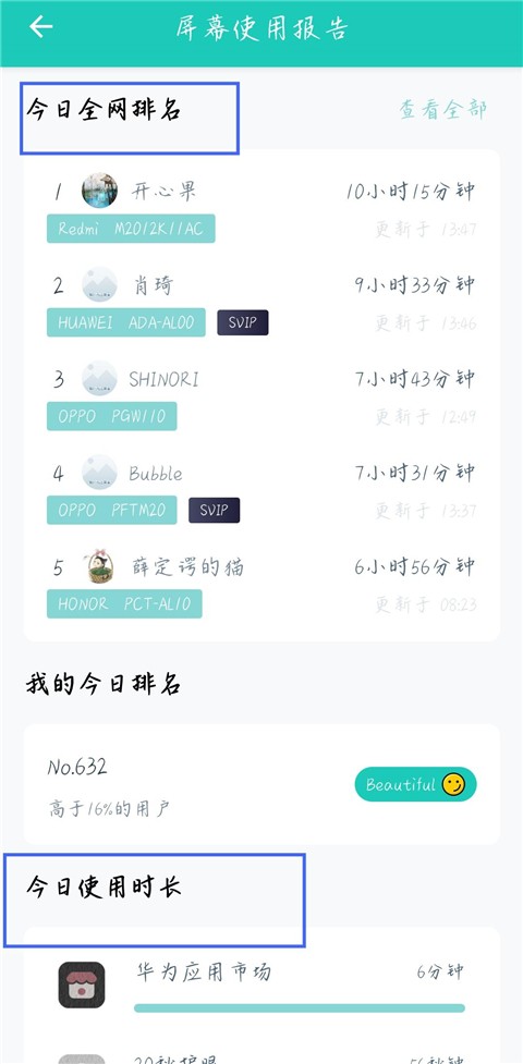 5、用户可以在此查看自己手机上各应用的排名以及使用时间。