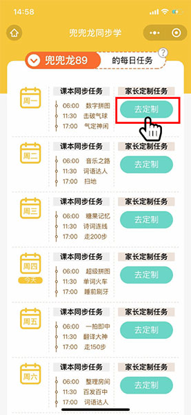 3.关注微信公众号后,您可以点击公众号的【定制任务】菜单栏,为孩子定制日常任务。