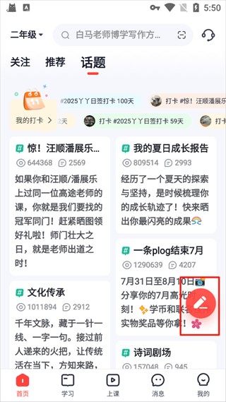 1. 打开高途课堂应用程序并选择主页上的主题部分。你可以参与大家的话题,也可以自己发布。