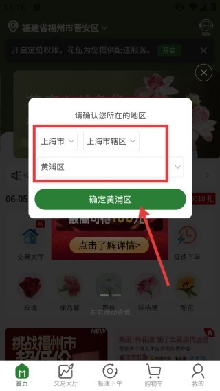 1. 在区域确认弹窗中,选择您所在的区域,点击【确认黄浦区】,并设置配送区域。