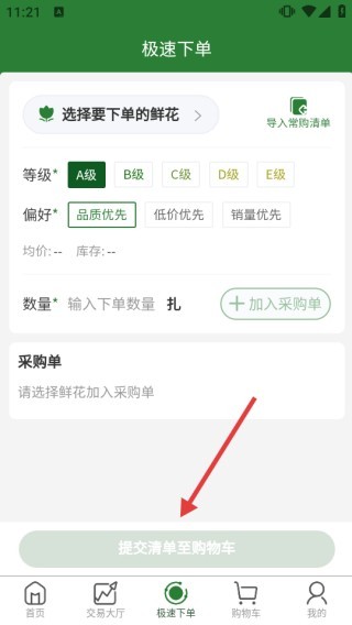 3. 在快速订购页面,选择鲜花等级、偏好、数量,点击【提交列表到购物车】完成订单准备。