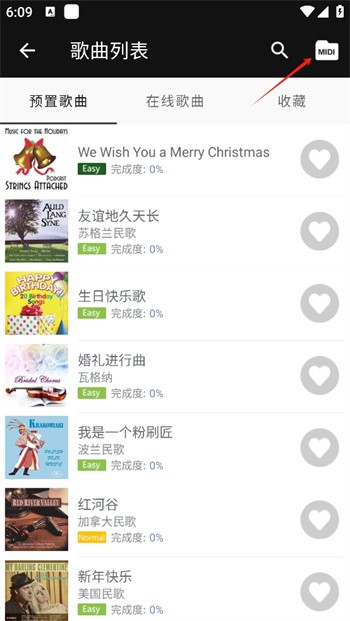 2、然后点击这里右上角的【MIDI】图标选项,继续进入本地文件夹,选择要导入的歌曲;