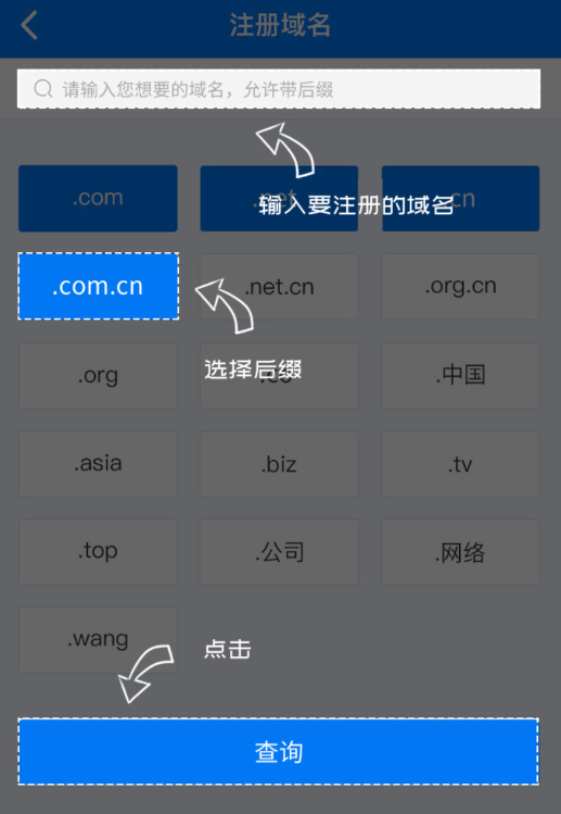 2、进入域名注册界面,输入要注册的域名,选择后缀,完成后点击“查询”。