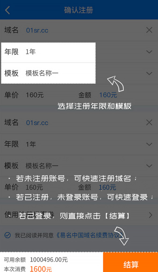 4. 确认注册信息。如果您还没有注册账户,可以快速注册域名。如果您已经注册但尚未登录账户,可以快速登录吗?如果您已经登录,可以直接点击结帐。