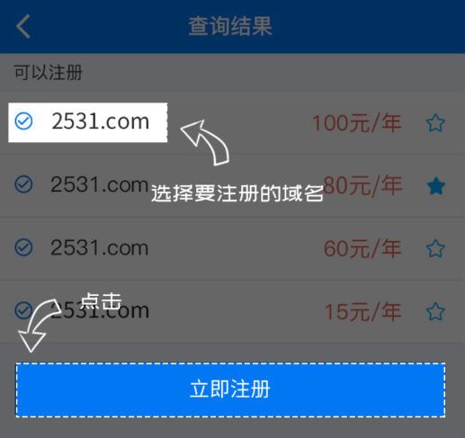 3、跳转到查询结果页面,选择需要注册的域名,点击立即注册。