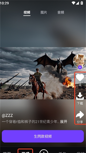 5.您可以点赞并收藏其他用户通过灵感广场发布的素材内容,并一键打造同款风格。