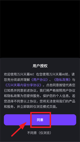 1、下载安装并打开万兴天幕AI大模型,在用户授权提示界面点击同意