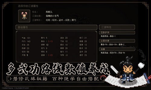 10万字的剧情故事,多分支多主线,遇见不同的江湖队友。他们要么是江湖浪子,要么是高校才女,要么是江洋的宫廷鹰派,要么是盗贼,可以自由选择是与武林一起浪迹江湖,还是背靠大树攀上权力巅峰,自由书写你的江湖故事;