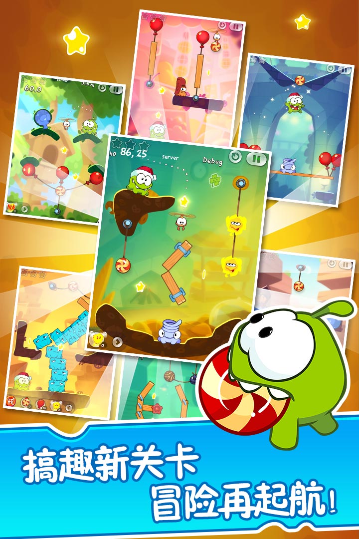 风靡全球的物理益智游戏——割绳子2 又回来了!这是Zeptolab开发的“割绳子系列”的第二代作品。新的角色,新的游戏元素,非常棘手的奖牌任务。当然,主角Om nom绿色怪物从未改变,糖果的收集也变得更加有趣! 2D界面,色彩缤纷的图片,闪闪发光的星星,栩栩如生的肥皂泡。相信《割绳子2》会给我们带来不一样的精彩。