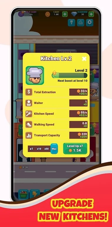 3.独特的放置玩法,离线也能赚取利润,让你轻松成为餐饮大亨。