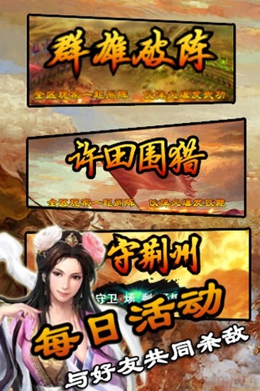 一款以三国战争为背景的战争策略游戏。三个王国最美丽的城市正等待您来装饰和建造。在互助升级的路上,会有一段美妙的爱情等待着你。穿越1800多年的历史,广纳名将,出兵征战。我们回到三国时代的古战场,感受冷兵器的冲击。 《葫芦三国》融合了前线战斗中大将阵型和武器对抗的变化,真实还原了古代战争场景,塑造了优秀的人物和音效。