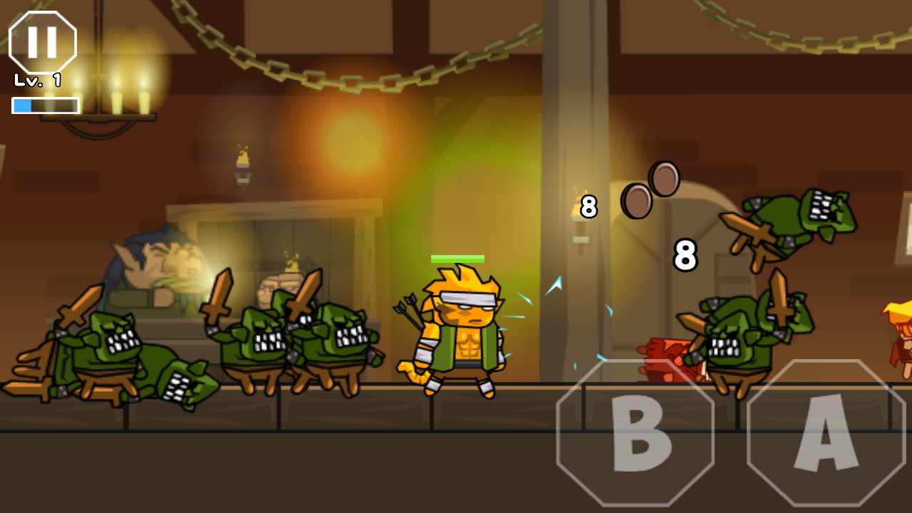选择角色后,我们就开始我们的职业生涯。采用虚拟摇杆进行操作。左侧为上、下、左、右控制键。它们不会被显示,因为它们是虚拟的。小编玩过之后发现,虚拟摇杆真是太神奇了,蹲着的时候还可以用盾牌挡住自己。后续关卡都离不开这个操作。抵御各种UFO的最好方法就是蹲下。这个A是攻击键,B是跳跃键。还有大招的释放,当然是附带CD的。使用这些按钮的组合操作来击败怪物再舒服不过了!一开始左右两侧会同时出现怪物。要想避免失血,就要靠行动之间的配合了。你可以跳到一侧攻击,也可以快速攻击左侧然后攻击右侧。速度是一切的前提。