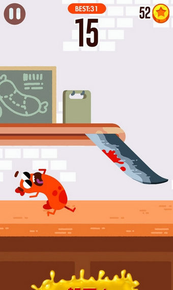 一款奇怪的跑酷游戏。游戏操作很简单。点击屏幕加速。如果速度快,玩家控制的香肠位置也会降低,通过那些烹饪厨具。虽然操作看起来还是很简单,但是玩起来真的很难。一不注意,就会碰到正在启动的陷阱或者自己太高了。就算厂家到了这一步,需要启动的陷阱,基本上也是在你们第一次见面的时候就启动了。盲目跑屏,只会吃一个闭门羹。