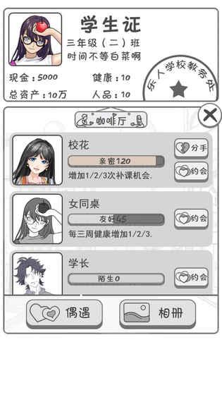 零花钱大战app下载是一款以校园食堂为背景的游戏。当玩家达到二年级时,遭遇系统将会开启。一次偶然的机会,你可能会遇到学校里的随机人物,也可能什么都没有遇到,这就是考验你血统的时候了。与遇到的角色互动并赠送礼物可以增加好感度。当好感度达到接近程度时,角色会由黑白变为彩色,同时触发相应的属性来帮助玩家进行游戏。不同的角色有不同的强化属性。