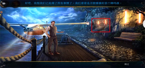 1.首先获得下图红框中的浮标和绳索,然后使用绿框中飞机上的绳索,点击飞机门,放大,进入并获得公文包。