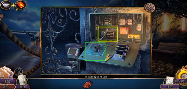 3、点击下图红框放大,用之前公文包里的尖嘴钳打开配电箱。然后点击配电箱中的红框即可获得电池。然后点击绿色框连接电线即可开始工作。盖上盒子并单击左侧的白色按钮。门将打开并前往门厅。