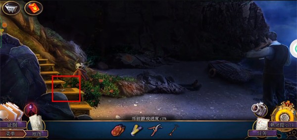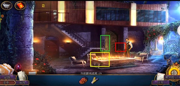 4. 进屋后与对方交谈。然后直接右上角到后院。在后院,先点击中间的侦探,得到红框的相机,然后点击黄框放大,得到修枝剪。点击绿色框放大,找到门左侧的气泵。最后,点击灰色框,使用刚拿到的相机拍照并留下证据即可完成教程。