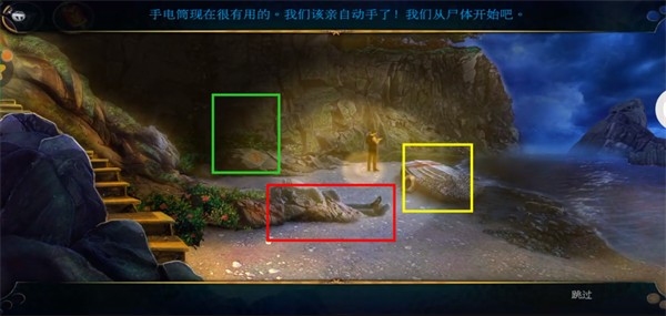 7. 返回悬崖并使用手电筒照射阴影。先点击红框放大,然后用相机对着尸体留下证据。将卡在尸体头上的布去掉后,用摄像头对着尸体的脸部留下证据。最后点击尸体上的手表即可获取证据。然后点击尸体上的衣服打开,找到钱包,得到里面的密码图案。然后单击黄色框中的船将其放大。点击取下救生圈后,在船左侧有绳子的地方使用充气浮标。然后使用气泵(气泵)。多次点击船后,你会得到马克的钱包。里面有一个注释可供阅读,您会得到线索。最后点击钱包左侧即可获得卡。然后单击绿色框将其放大,并使用修剪器将第二个金字塔碎片放入其中。