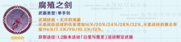 该武器为首发活动限定道具。具有很好的通用性和属性加成,可以增加元素能量和伤害。