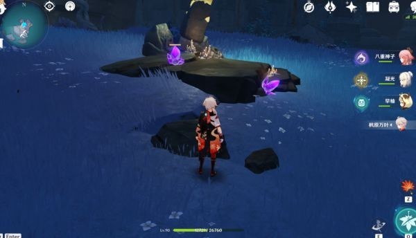 1、在蛇心之地北侧的传送点,向北转身直行滑翔下到两个平台。回头后可以看到矿场,梨花花守着3个紫晶块