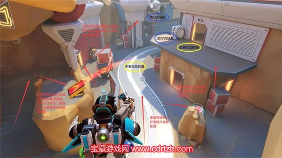 进攻方重新装弹,支援英雄从地上推车。如果高台被防守方占据,可以利用蹦床上的高台配合队友抢占高台。