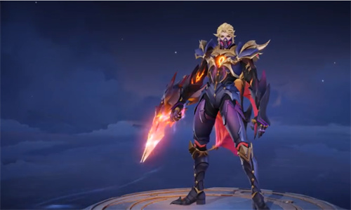 作为潇洒又神秘的猎兽人,兰陵王的肩甲以兽甲为主造型,他佩戴全副武装的发光面罩,自带恶魔翅膀与兽翼披风,火焰纹路的手臂,和胸前火焰恶魔眼特效相呼应,展现猎兽人的神秘与力量;部件组合样式的腿甲、手臂护甲,灵感源于兽甲的搭配方式,增强刺客感;武器设计以恶魔头部的三角结构作为设计灵感,散发火焰般的光芒。