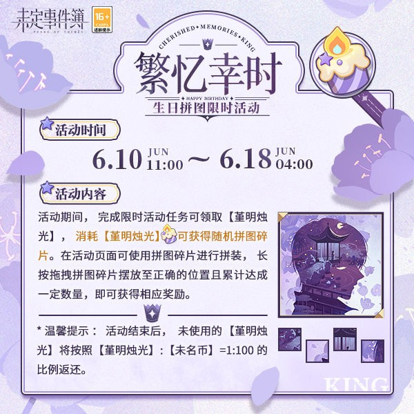 活动期间,完成限时活动任务可领取【堇明烛光】,消耗【堇明烛光】可获得随机拼图碎片。