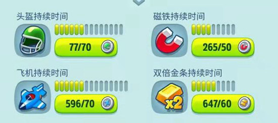 游戏中还有各种各样的道具,玩家需要利用这些道具来帮助自己获得高分。比如磁铁、飞机、头盔都是非常关键的道具。如果这些道具出现在跑酷跑道上,玩家一定要记得收获这些道具。